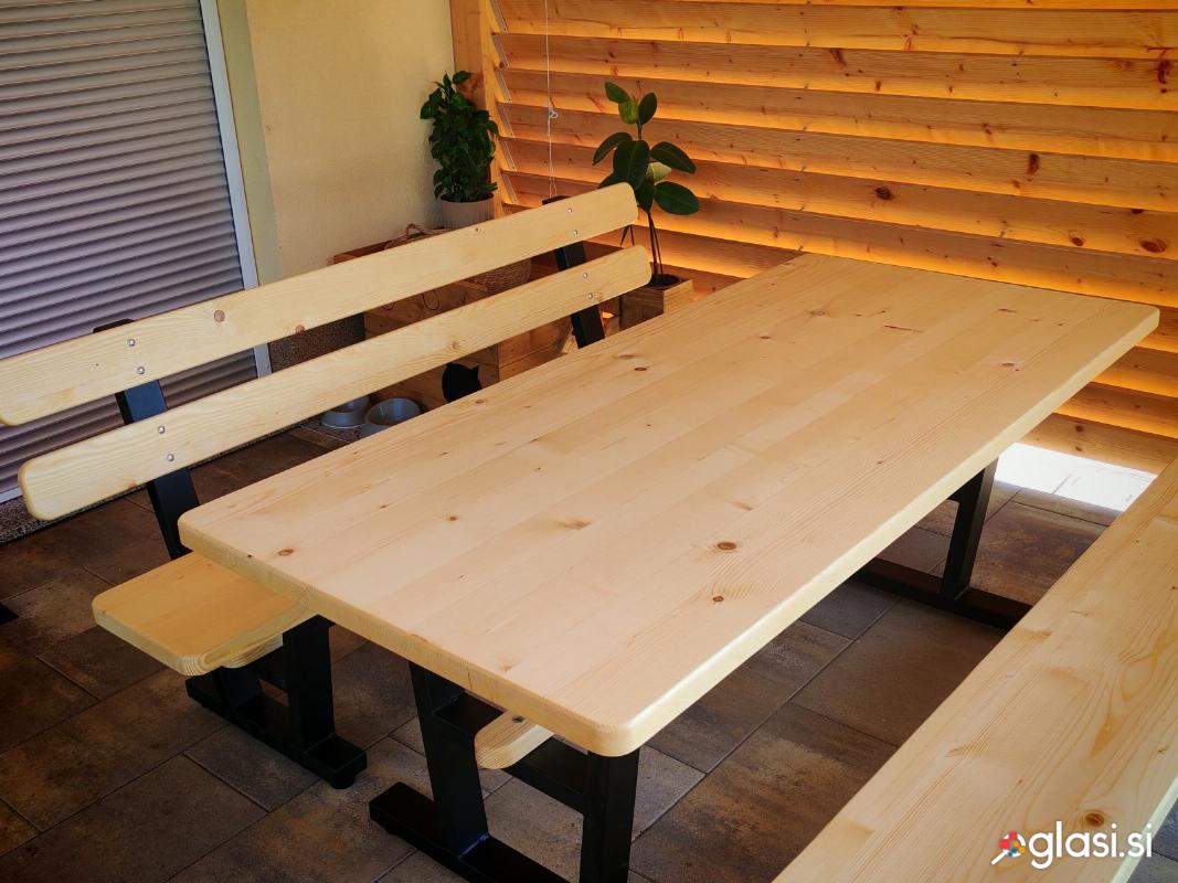 Vrtna garnitura izdelana iz masivnega lesa smreke. 3 krat zaščitena s kvalitetnim oljem. Podnožje je kovinsko, prašno barvano, s temeljno ter pokrivno barvo. Nastavljive nogice. Celotna garnitura je privijačena z metričnimi vijaki.