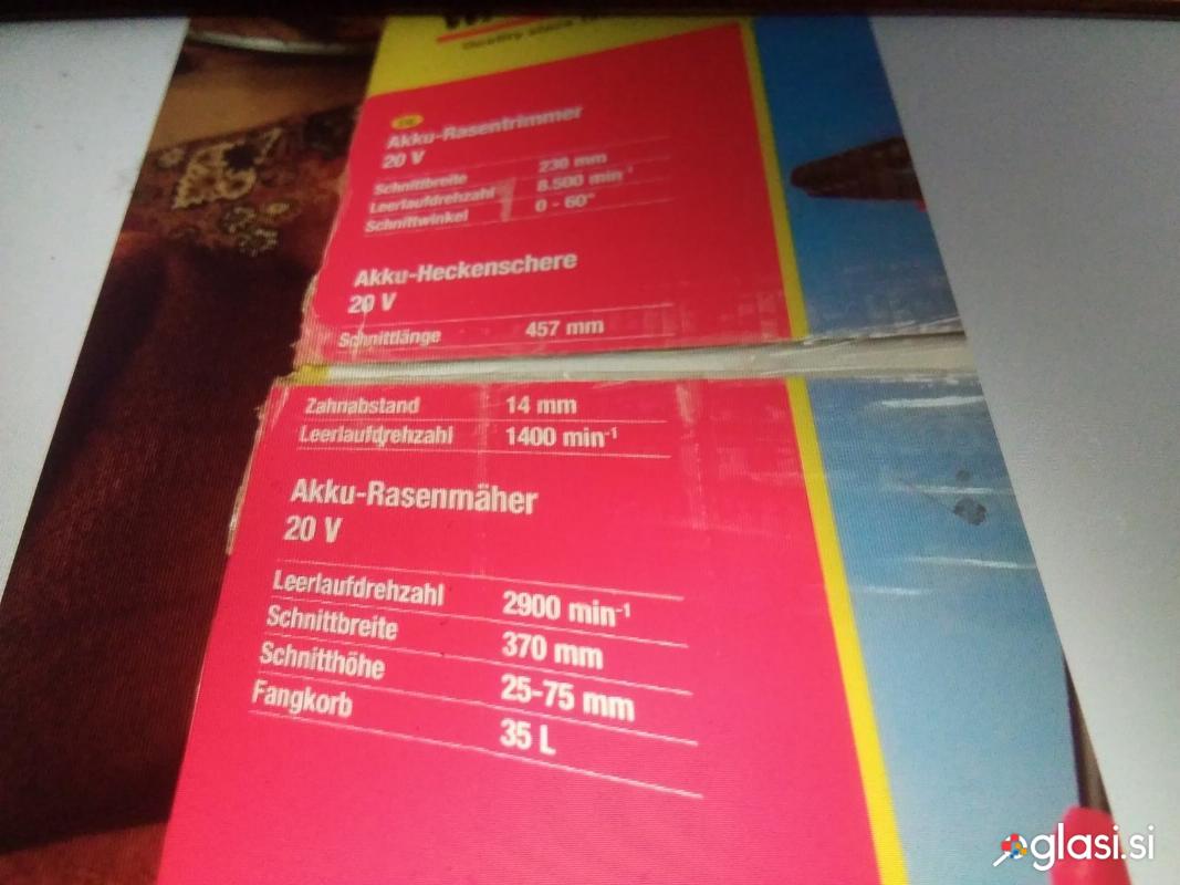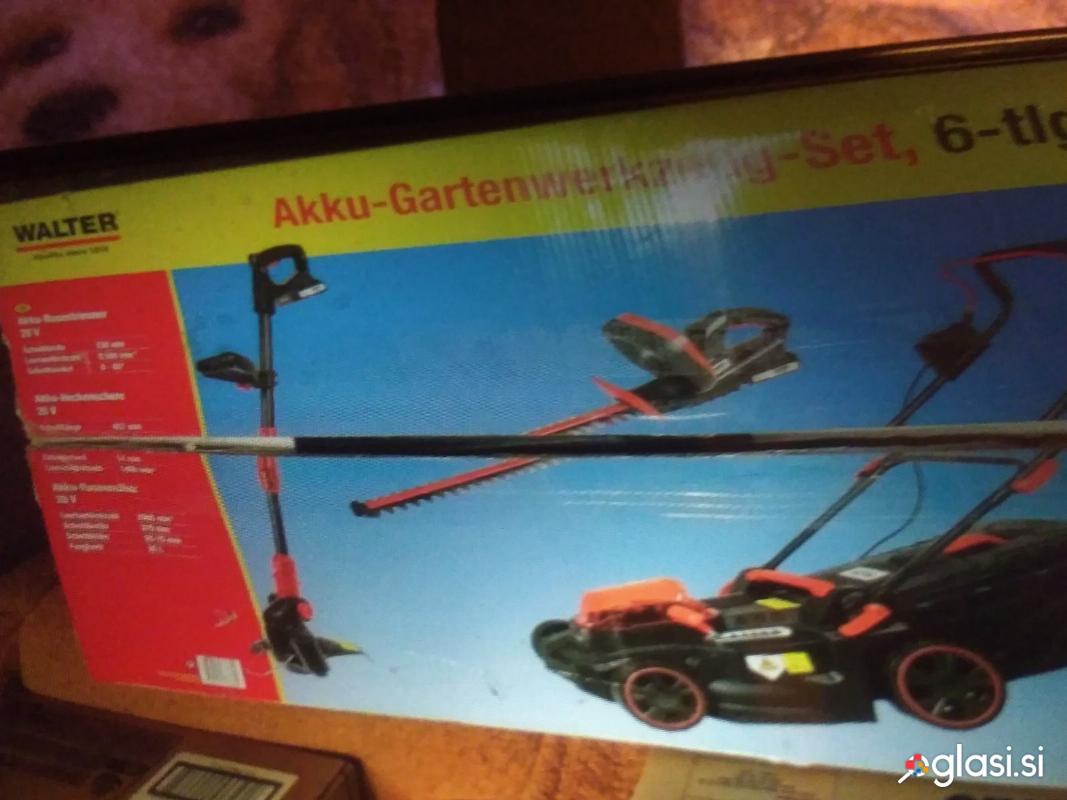 Kosilnico, še v original škatli, set 3 v 1, baterijsko travniška za košnjo širina reza 37 cm, cca. 400 m2 kosilnico s košem,druga je na silk za okoli dreves, ograje robovi, za fuge tlakovcev čistit, ter tretja je za obrezovanje žive meje, cipres z baterijo in polnilcem cena 170 eur, v škatli tri izdelki, ena baterija za vse tri