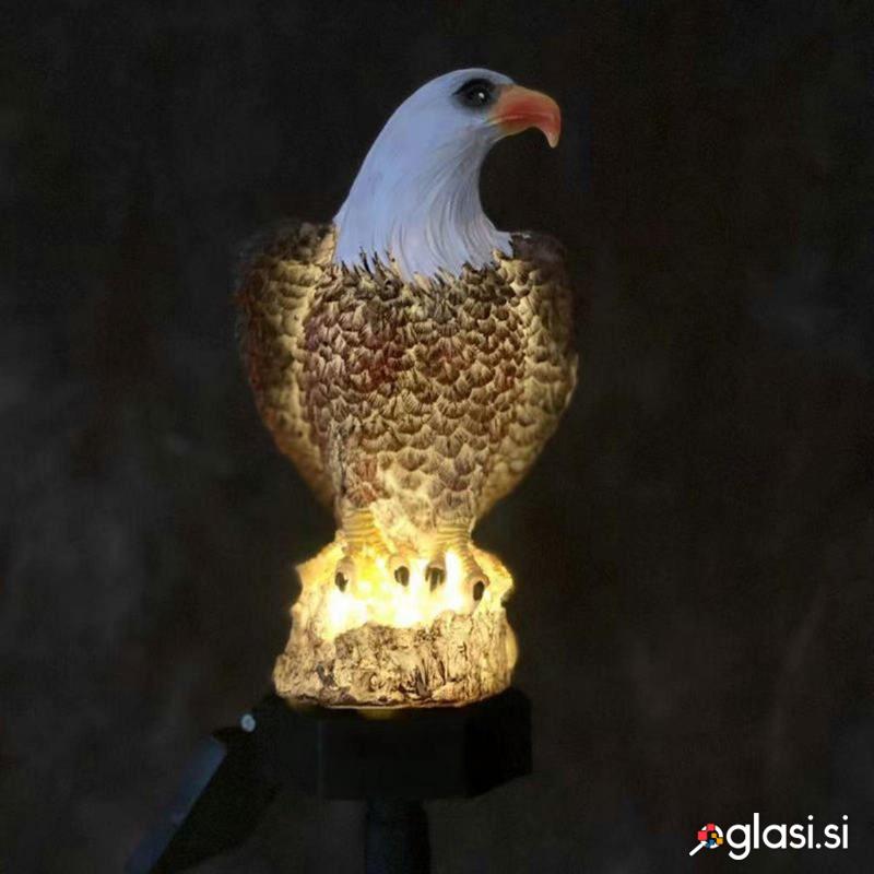 Nenavadna, solarna LED vrtna svetilka v obliki orla. Odličen dekorativni element. Svetilka se napaja s sončno energijo, ki s pomočjo solarne plošče polni vgrajeno polnilno baterijo. Naprava se samodejno zažene, ko se zmrači (opremljena je s senzorjem mraka), polna baterija pa zadošča za do 8 ur neprekinjenega delovanja. Svetilka ima LED, ki oddaja belo svetlobo. Močna konica omogoča zanesljivo in hitro namestitev svetilke v tla, vodotesno ohišje pa zagotavlja nemoteno uporabo ne glede na vremenske razmere.